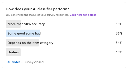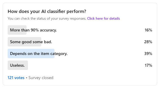 Isn’t this a fatal flaw in the work of HS classification? Additionally, with 15% responding that it is “useless,” a total of 85% of people believe that the answers from AI classifiers are not perfect.