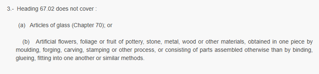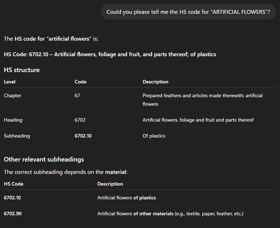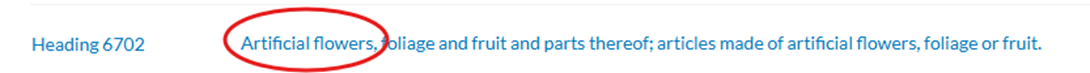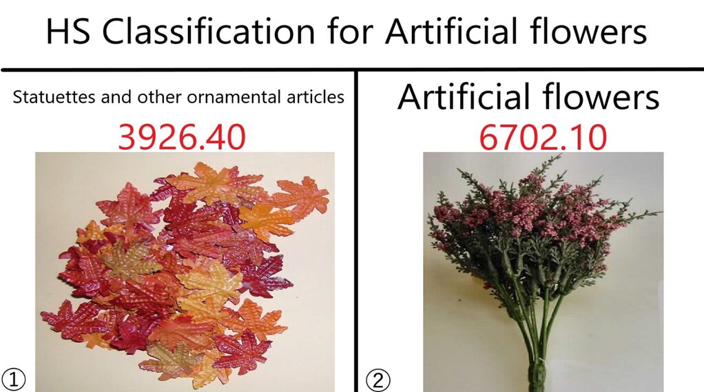 When classifying “ARTIFICIAL FLOWERS,” it appears as though searching by the product name will yield an immediate answer. If you let an AI or a similar tool handle the classification without careful thought, it will likely identify “ARTIFICIAL FLOWERS” under HS 6702 and conclude that this is a simple and correct solution.