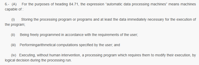 1. The “Freely Programmable” Requirement (Note 6(A)(ii)) Before looking at the function, a device must first meet the definition of an Automatic Data Processing (ADP) machine. Under Note 6(A)(ii), a machine must be “freely programmable” in accordance with the requirements of the user. If the OS is locked or the hardware is restricted to a specific application, it fails this primary test and is immediately disqualified from 8471.