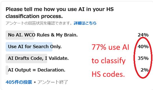 Next, I conducted a poll on LinkedIn titled, “Please tell me how you use AI in your HS classification process.” The results are as follows.