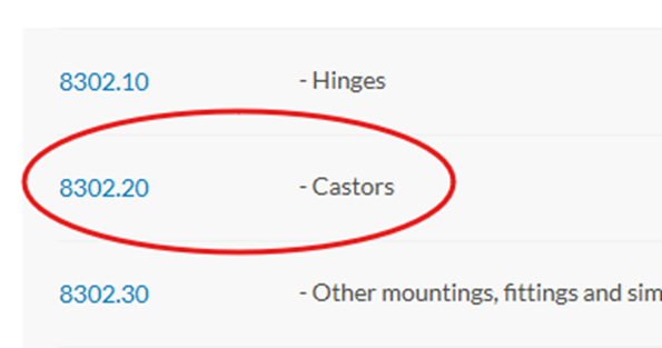 When classifying a standard caster with a ‘plastic wheel’ attached to a ‘steel mount,’ a quick keyword search for ‘caster’ will bring up its HS code directly. This might lead you to believe it’s an ‘easy item to classify.