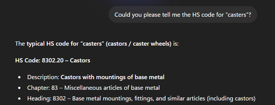 At first glance, the classification seems straightforward because the product name “Casters” is linked to HS code 8302.20, making it appear as though the task could be entirely outsourced to an AI.