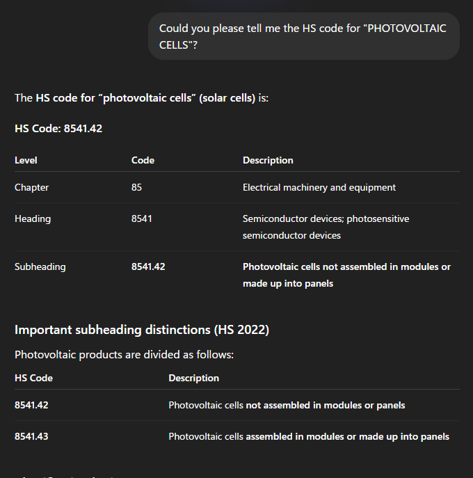 If you input “PHOTOVOLTAIC CELLS” into an AI or automated tool, it will likely return the same HS code. However, actual European Union Binding Tariff Information (BTI) clearly distinguishes them as follows: